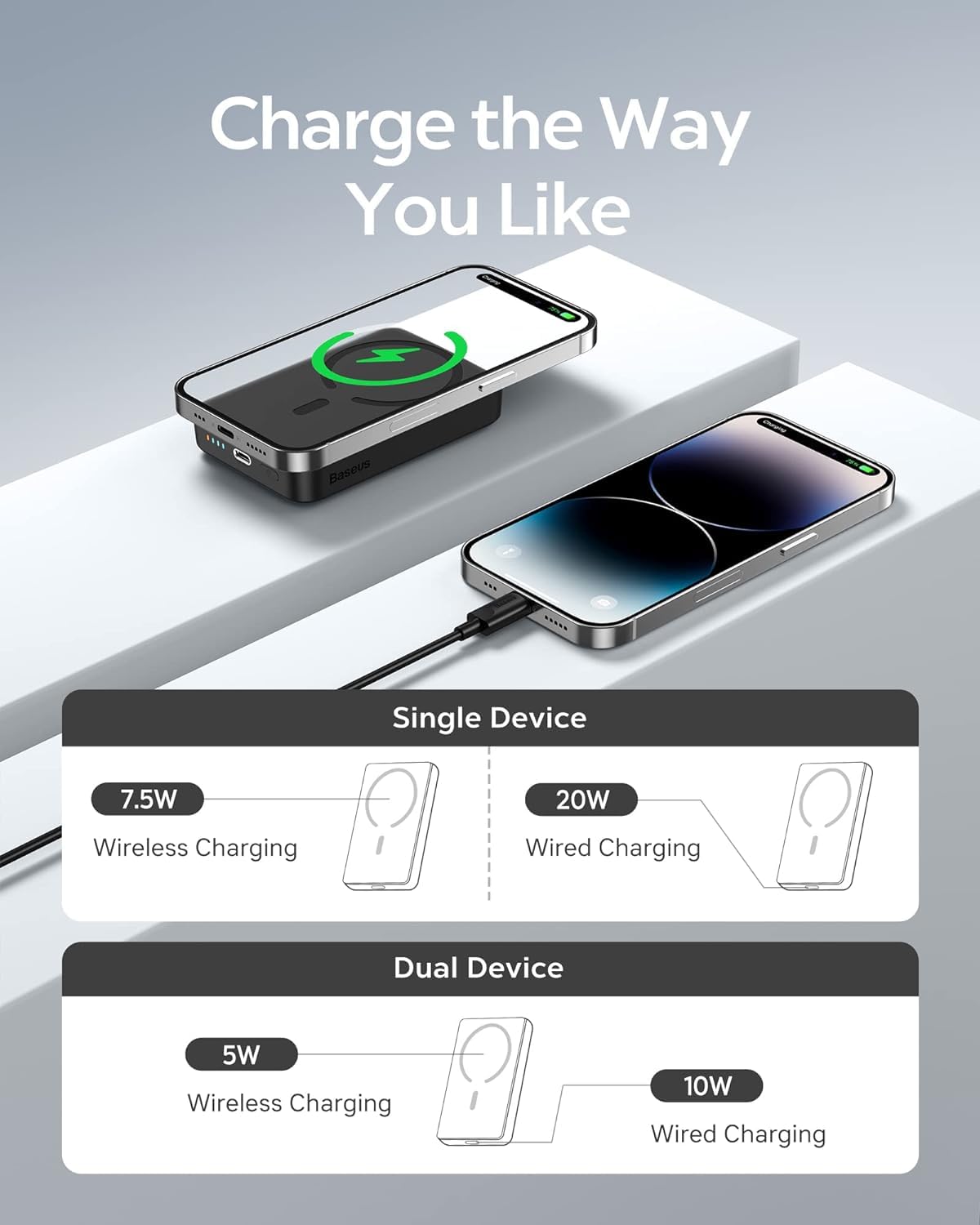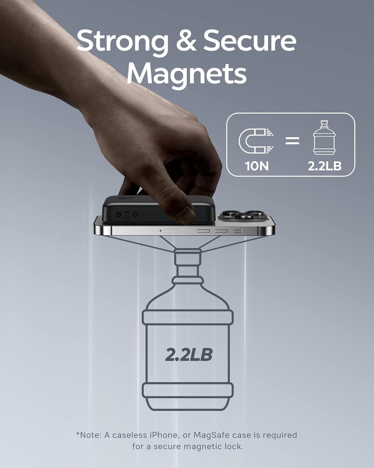 - 【Secure Magnets& Wireless Charging】 Passed FCC certification, equipped with powerful magnets securely lock to the back of your iPhone, and the magnetic pulling force value is 10N(≈2.2LB). Our 20W USB-C port allows you to fast charge your iPhone 15 Pro to 50% in just 30 minutes. Plus, our magnetic battery pack can be fully charged in under 2 hours with a 18W PD charger (not included). It also supports pass-through charging, so you can charge your phone and the battery pack at the same time