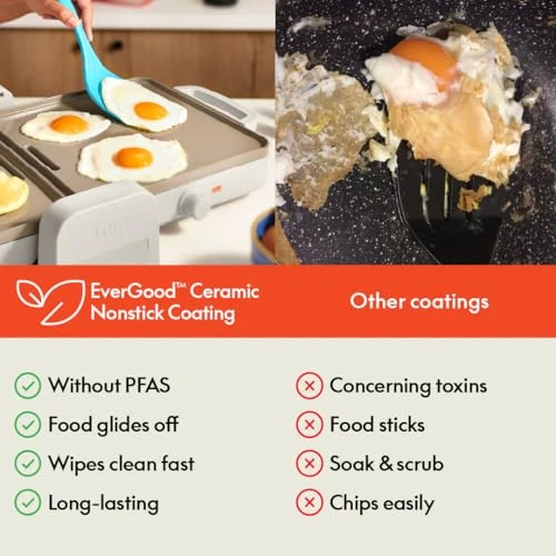 - Nonstick Magic with EverGood Coating: Cooking’s a dream with our EverGood Ceramic Nonstick Coating, free of PFAS, PFOA, PTFE, lead, and cadmium. Flip, slide, and serve effortlessly, knowing your food stays healthy and your griddle stays clean