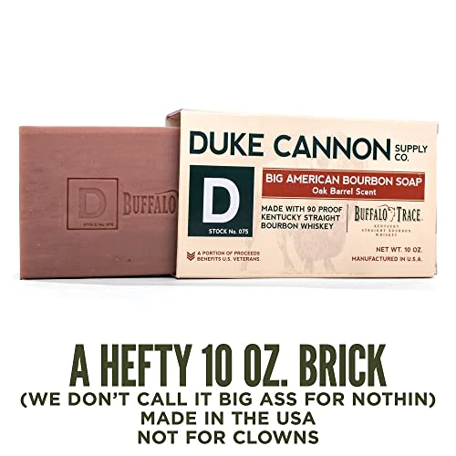 Details: In the early days of the American Frontier, rugged pioneers indulged with a dry buffalo steak and a pull of whiskey, not a appletini and a plate of bruschetta. Duke Cannon honors that independent, pioneering spirit by partnering with Buffalo Trace Distillery to add their award-winning Kentucky Straight Bourbon Whiskey to this Big American Bourbon Soap. Weighing in at a full 10 oz., this large, American-made soap has a rich, oak barrel scent that smells as good as bourbon tastes. Product Features: 2-3x the size of common, dainty soaps. Has small bits of ground corn which help rough up dead skin cells. The unique, oak barrel scent is masculine and outstanding, but not overpowering. Yes, we really put delicious Buffalo Trace Bourbon in the soap. Does Bourbon benefit the skin? We have no idea, but bourbon tends to make everything better, so why not? A portion of proceeds benefits U.S Veterans. Made in U.S.A
