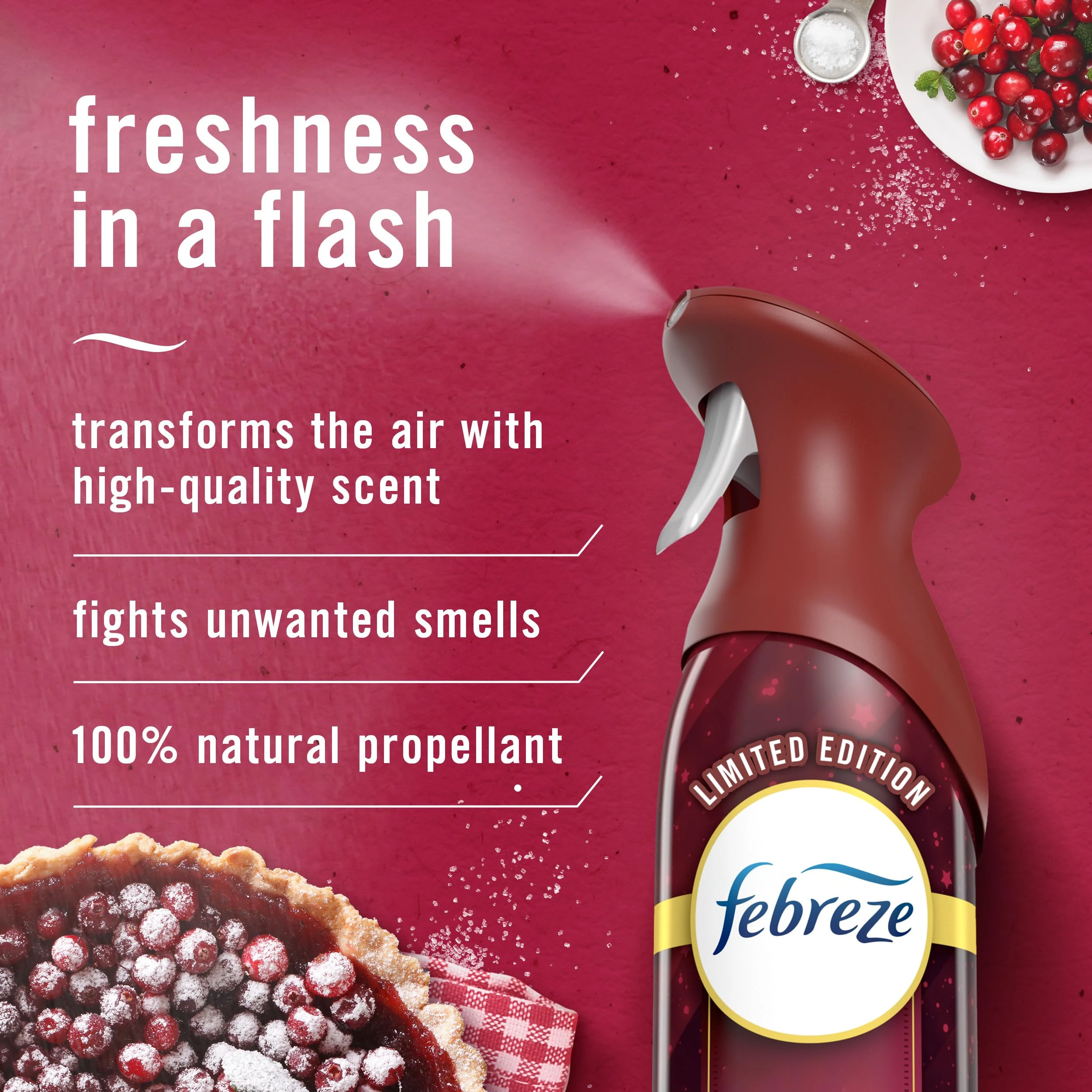 Details: Odors. They’re everywhere… lingering in the air or arising at the most awkward times. Forget masking them with some froo-froo spray; Febreze Air Effects actually fights air odors. This can of ahhh-some straight up fights stink with a neat little molecule called cyclodextrin (Bonus: It’s naturally made from corn). It’s a handy air freshener that’s easy to use: Simply spray in a sweeping motion and fight those bad smells anywhere… the bathroom, the kitchen, that cabin you rented for the weekend, the shoe closet, your kid’s room… anytime you want an instant burst of fresh. With the sparkling scent of sugary red berries in Cranberry Crumble, you can bring the festive to any occasion this season. And because Febreze AIR uses 100% natural propellants, you can confidently freshen your home every day. Looking for even more ways to breathe happy with Febreze? Take the freshness on the road with CAR Vent Clips.