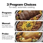- YOUR CHOICE COOKING: Three smart settings – probe, program and manual – allow you to cook foods to a specific temperature, for a set number of hours or on High, Low or Warm settings for up to 24 hrs