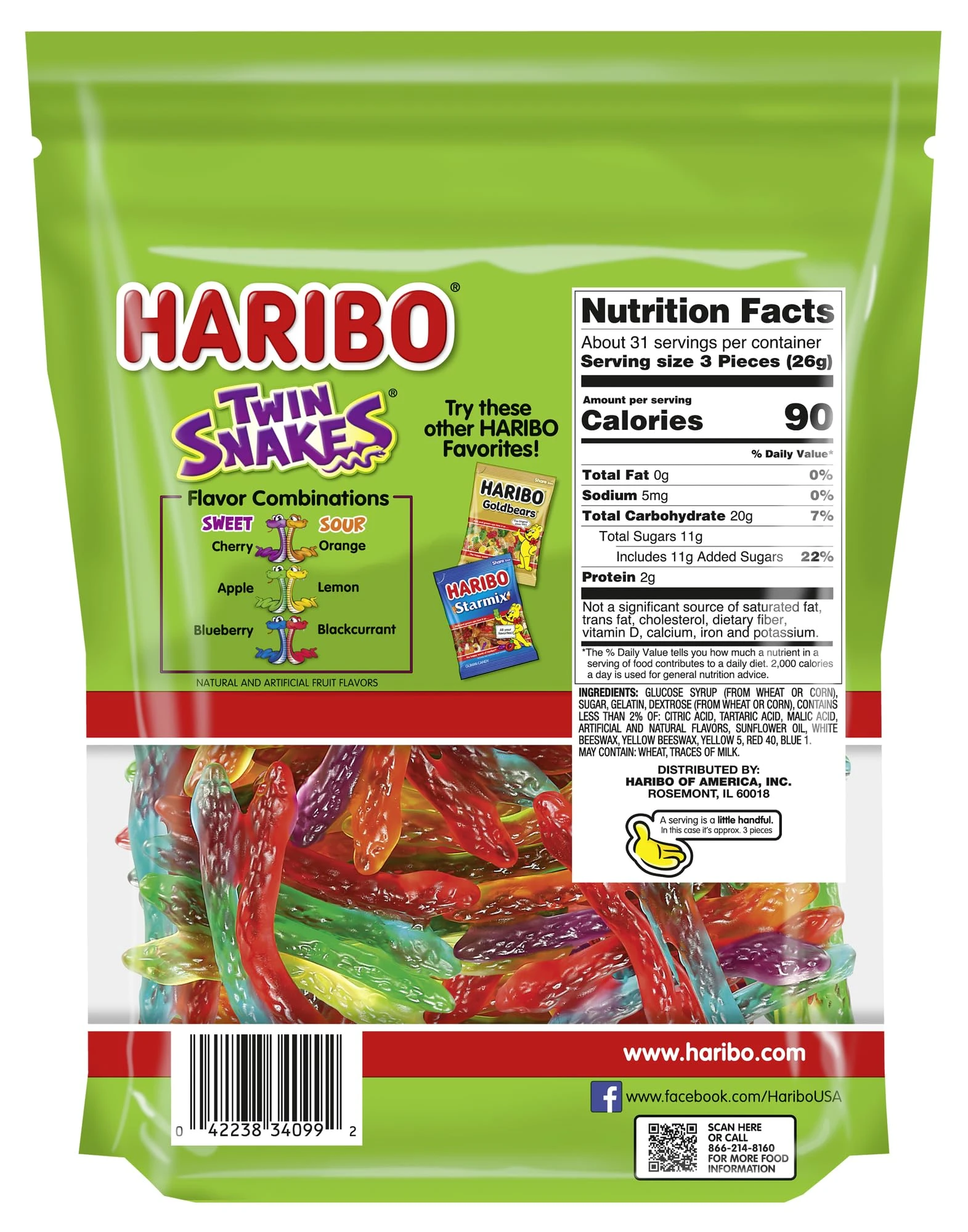 HARIBO Gummi Candy, Twin Snakes Sweet & Sour Gummy Candy, 28.8 Ounce Resealable Party Size Stand Up Bag, Soft & Chewy Snacks, Assorted Fruity Flavors