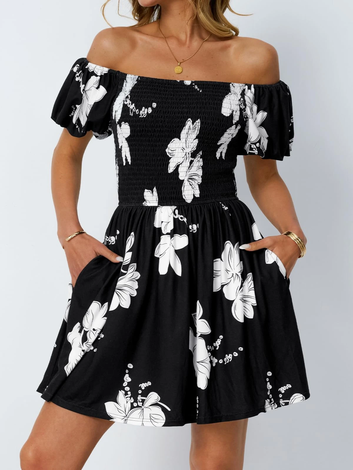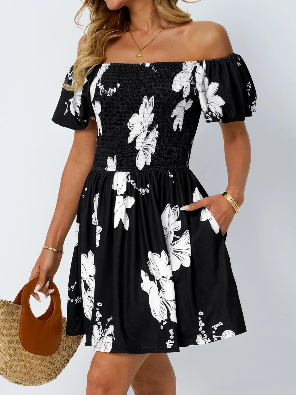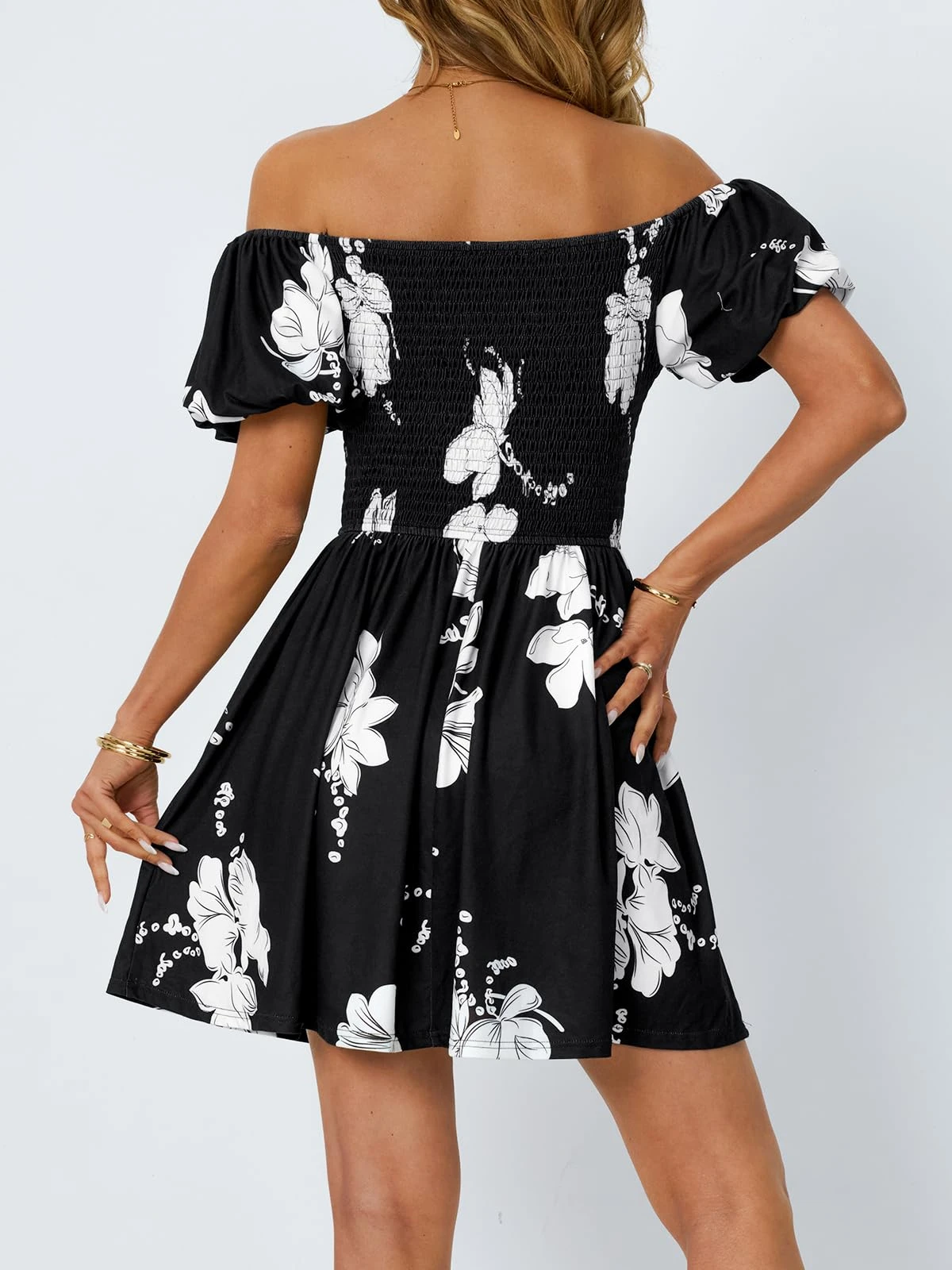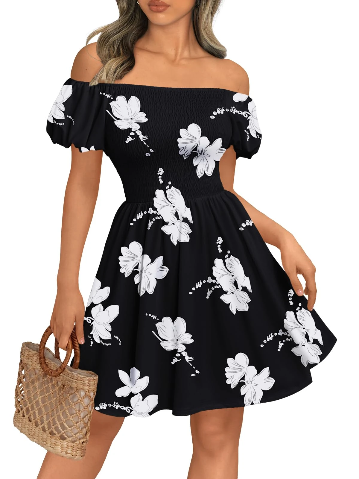 - Feature:This women’s beach dress is a stunning combination of elegance and comfort. It features an off-the-shoulder neckline that gracefully frames your shoulders, paired with charming short puffy sleeves that add a touch of playfulness.High-waisted, tummy-skimming design accentuates your figure. The beautiful floral pattern adds a vibrant touch, perfect for sunny days and parties.