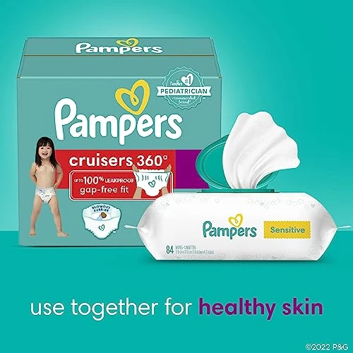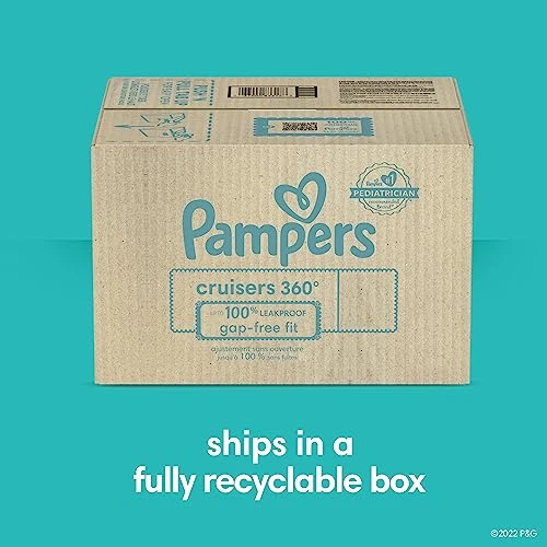 Pampers Cruisers 360 diapers are our best fit and protection for your active baby. Unlike ordinary disposable diapers that gap in the back, Pampers Cruisers 360 diapers stretch comfortably around your baby’s waist and adapt to their every move for a flexible, gap-free fit that is up to 100% leakproof. Plus, they feature our Dual Leak-Guard Barriers that gently seal around your baby’s legs, where leaks happen most. And forget fiddling with ordinary diaper tapes! Pampers Cruisers 360 has a 360-degree stretchy waistband designed to quickly and easily pull up onto your wiggly baby. And when a diaper change is complete, we’ve made disposal simple. All you need to do is RIP the Easy-Tear Sides and ROLL the diaper, then secure it with the disposal tape that comes attached to the back. Simple as that. Also, to keep your baby’s delicate skin healthy, Pampers Cruisers 360 delivers breathable dryness, pulling out wetness and locking it away from skin using our exclusive LockAway Channels. Plus, Cruisers 360 is hypoallergenic—completely free of elemental chlorine bleaching, parabens and latex.* For protection that will keep your little one happy and comfy on-the-go, trust Pampers, the #1 pediatrician recommended brand. *Natural rubber