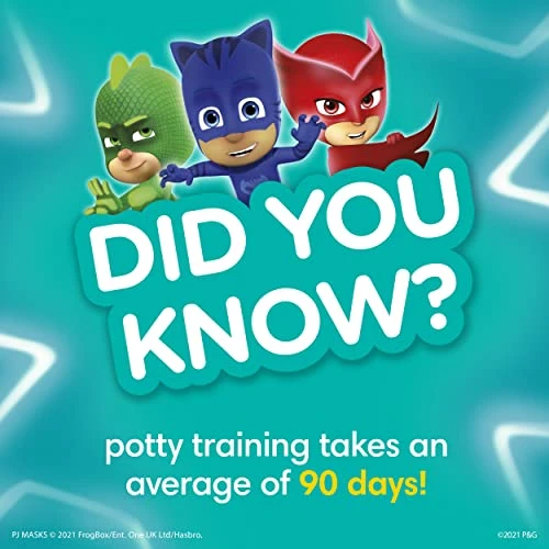 Potty-train like a hero with PJ Masks Pampers Easy Ups Training Pants. Featuring your favorite heroes Catboy, Owlette and Gekko, these super soft and comfy training pants fit just like real cotton undies with a 360 stretchy waistband that is gentle on your child’s skin and easy to pull up and down. Plus, they’re dermatologically tested, hypoallergenic, and free of parabens and latex.* That’s just one of the many reasons Pampers is the #1 pediatrician recommended brand. When it comes to potty accidents, your toddler will be covered with up to 100% leakproof protection. To protect where leaks happen most, Easy Ups are made with Dual Leak-Guard Barriers around the leg cuffs while Extra Absorb Channels quickly absorb accidents and lock them away from your toddler’s skin. And when it’s time to take them off, Easy-Tear Sides make removal and disposal a cinch. Potty-training is a journey and can take your toddler 90 days on average to catch on. So, Pampers Easy Ups makes it easy with each box containing a one-month supply of training pants. Available in sizes 2T–3T (16–34 lb), 3T–4T (30–40 lb), 4T–5T (37+ lb) and 5T– 6T (41+ lb).