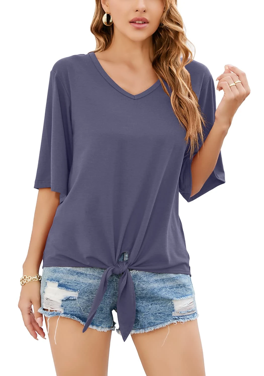 - -Tie knot front hem, 3/4 bell sleeve shirt, front v neck, back v neck, loose fit tops, casual style.